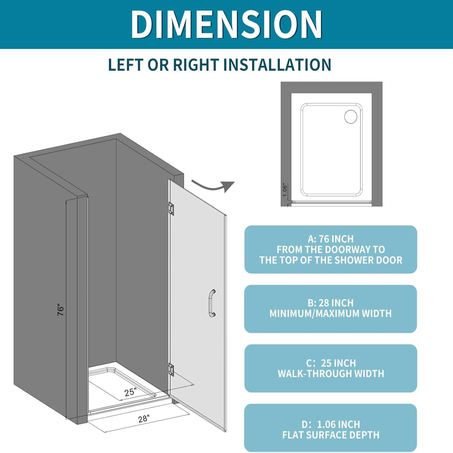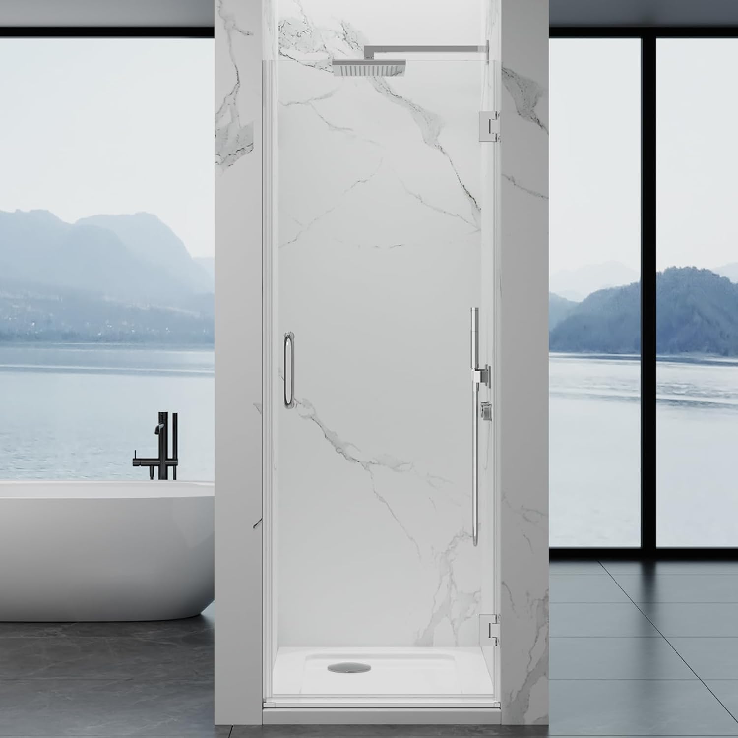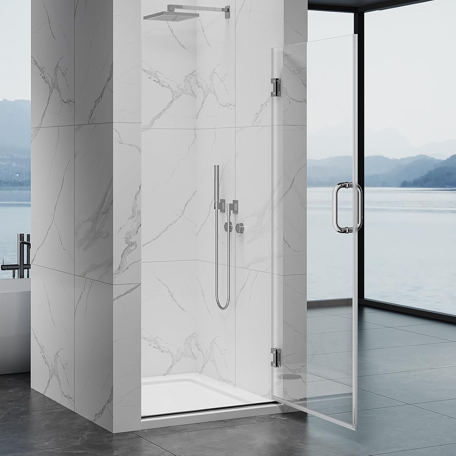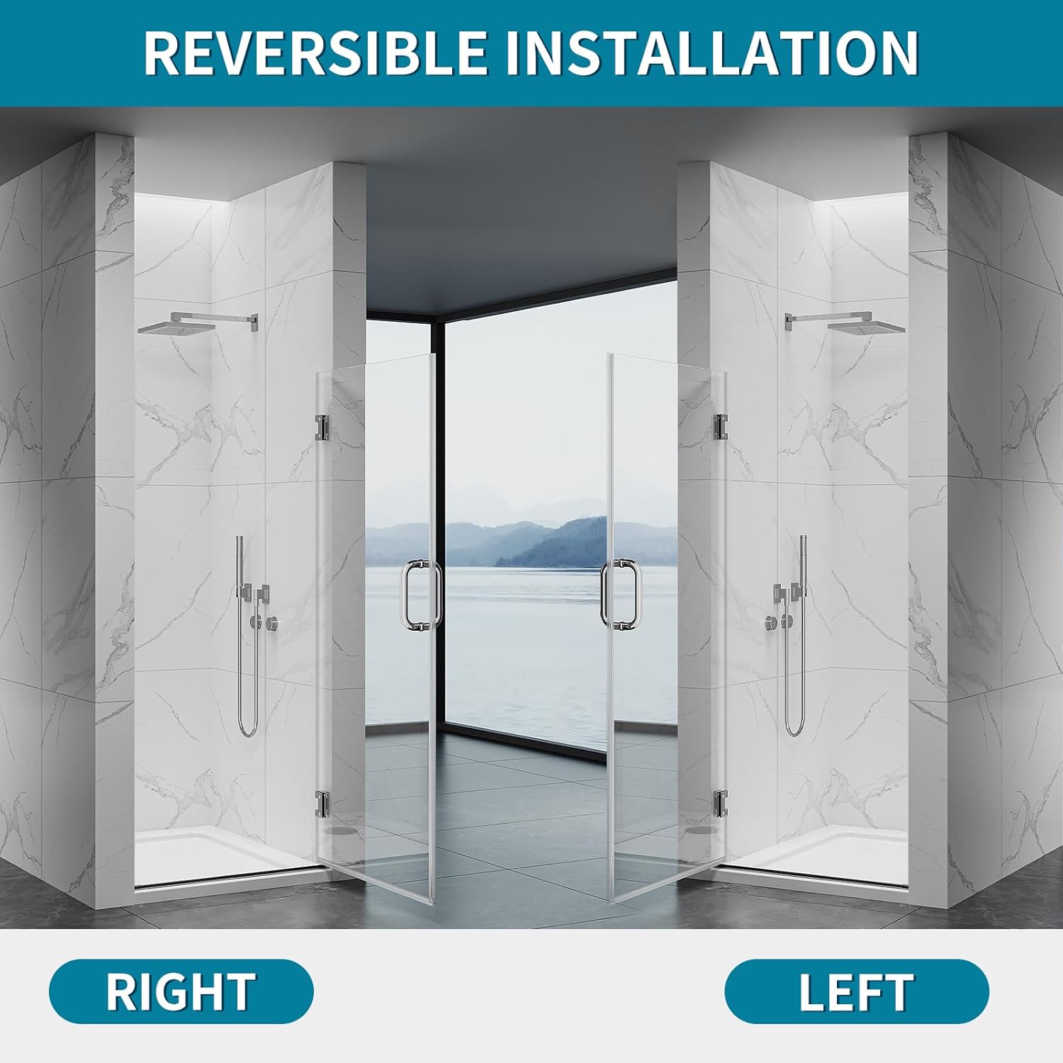 Sleek & Modern Design: Frameless pivot door (28"W x 76"H) with minimalist style, ideal for small/medium bathrooms. Matte Black or Bright Chrome finishes blend with any decor.
