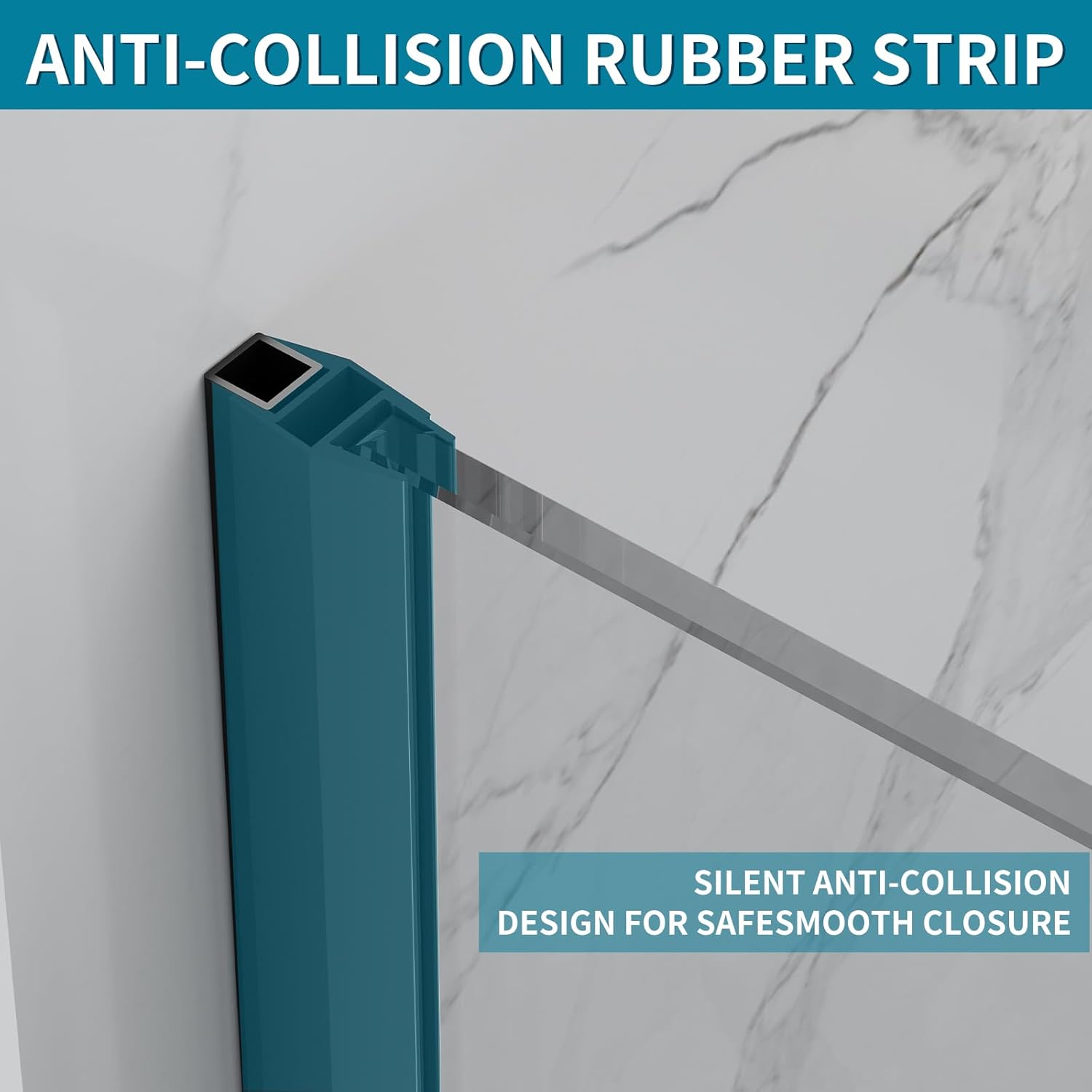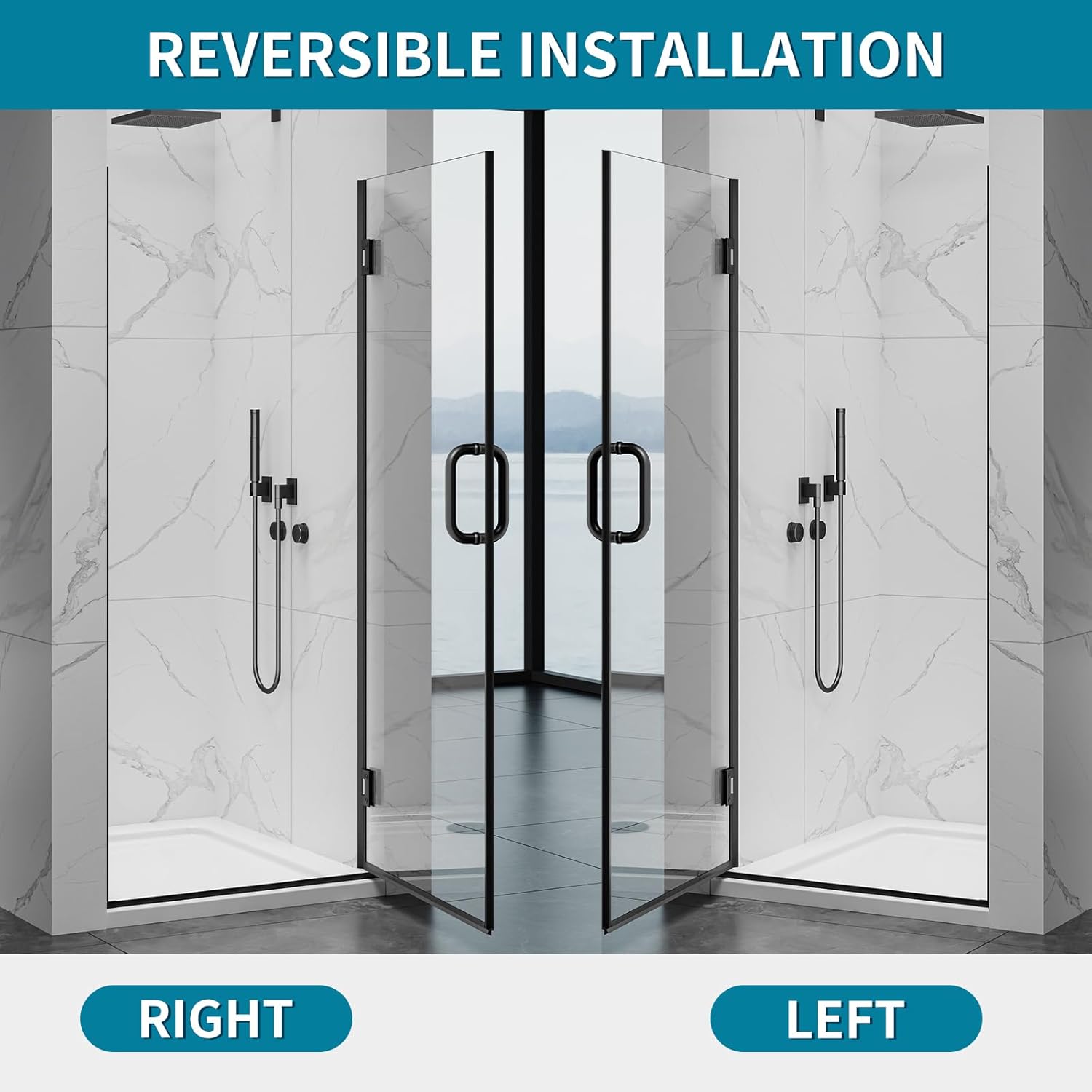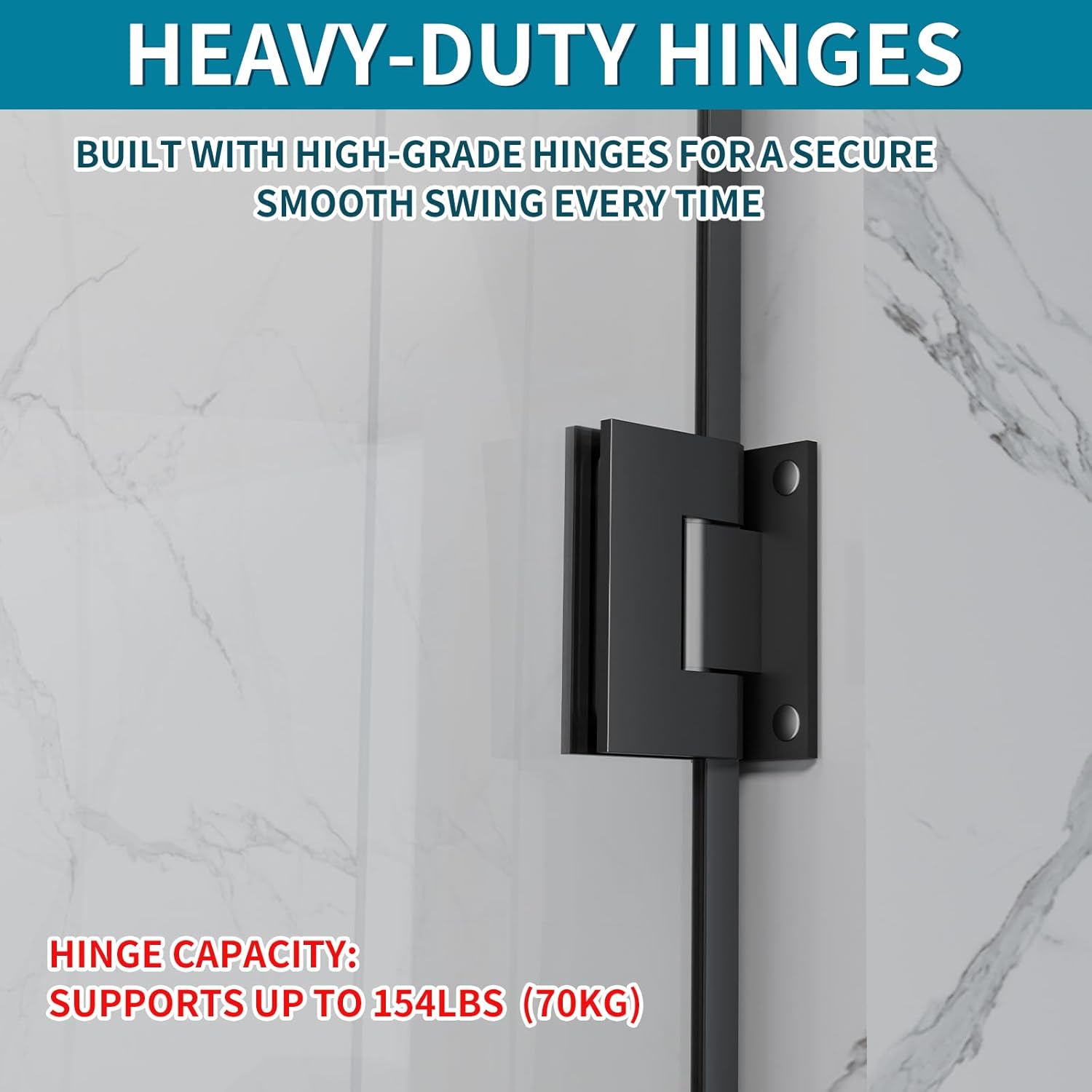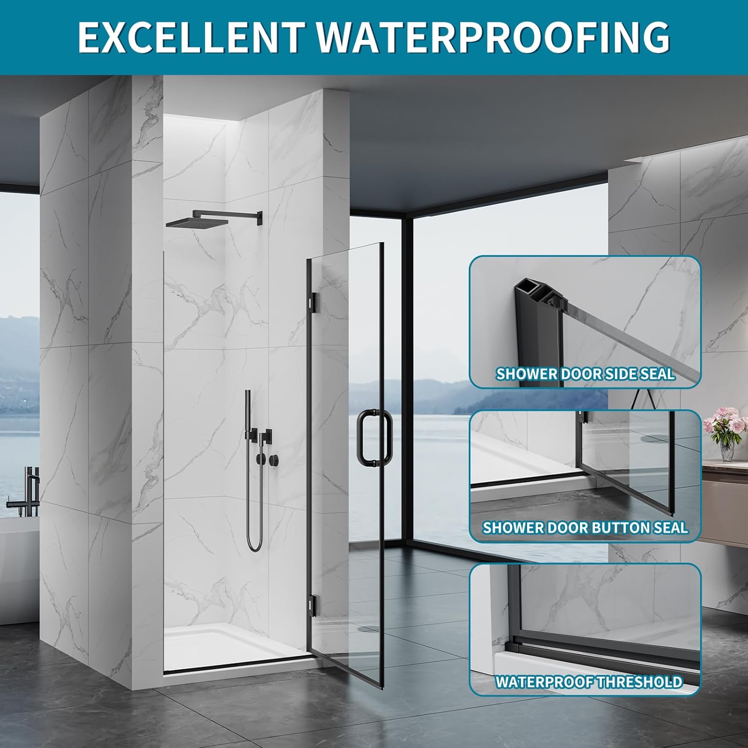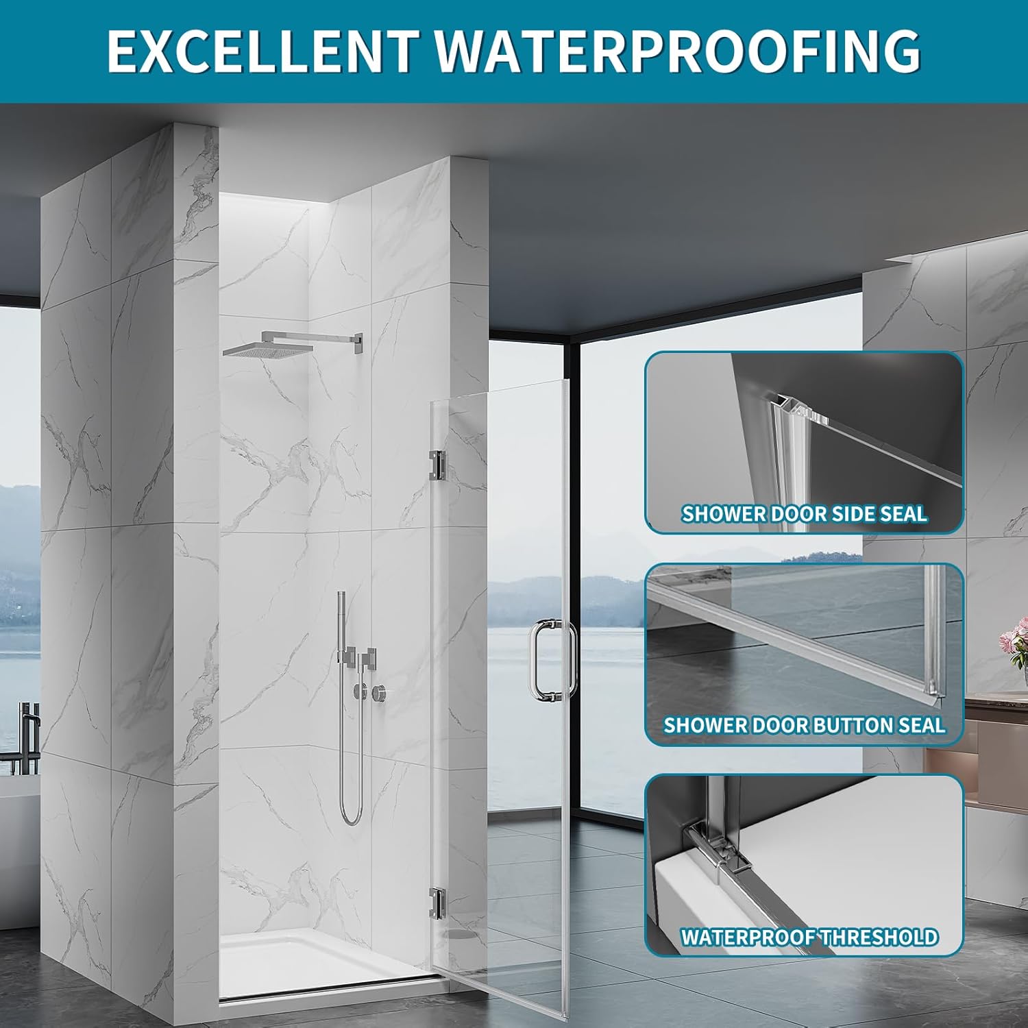Sleek & Modern Design: Frameless pivot door (28"W x 76"H) with minimalist style, ideal for small/medium bathrooms. Matte Black or Bright Chrome finishes blend with any decor.